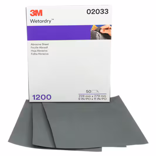 The 3M Wetordry Abrasive Sheet 401Q, model 02033, features a fine 1200+ grit designed for optimal sanding performance on automotive surfaces. Its versatile design allows for both wet and dry applications, utilizing a waterproof backing to minimize clogging and enhance durability. Ideal for tasks like paint finishing and smoothing, this high-quality sheet delivers consistent scratch patterns and superior results.